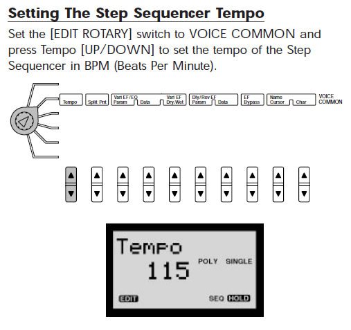 Set the [EDIT ROTARY] switch to VOICE COMMON and press Tempo [UP/DOWN] to set the tempo of the Step Sequencer in BPM (Beats Per Minute).